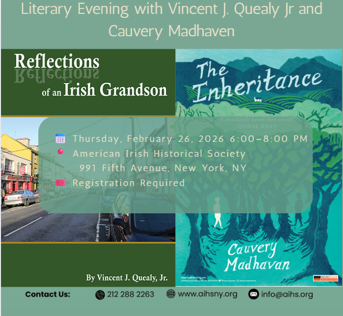 We are excited to welcome Vincent J Quealy Jr and Cauvery Madhavan for a literary discussion of their impressive books ‘Reflections of an Irish Grandson’ and ‘The Inheritance’.
